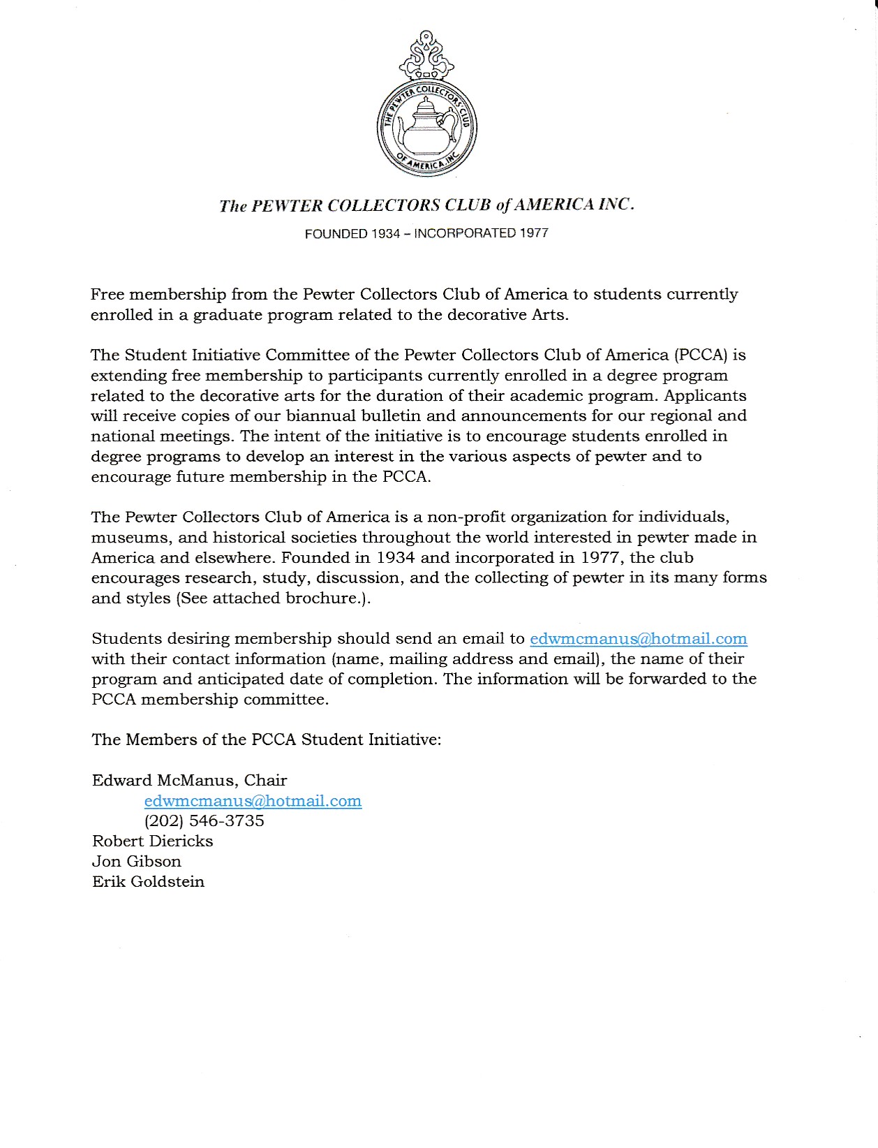 Members receive the monthly PCCA Update email bulletin with news about The Pewter Collectors Club of America, Inc. If you are not a member, we invite you to sign up here.